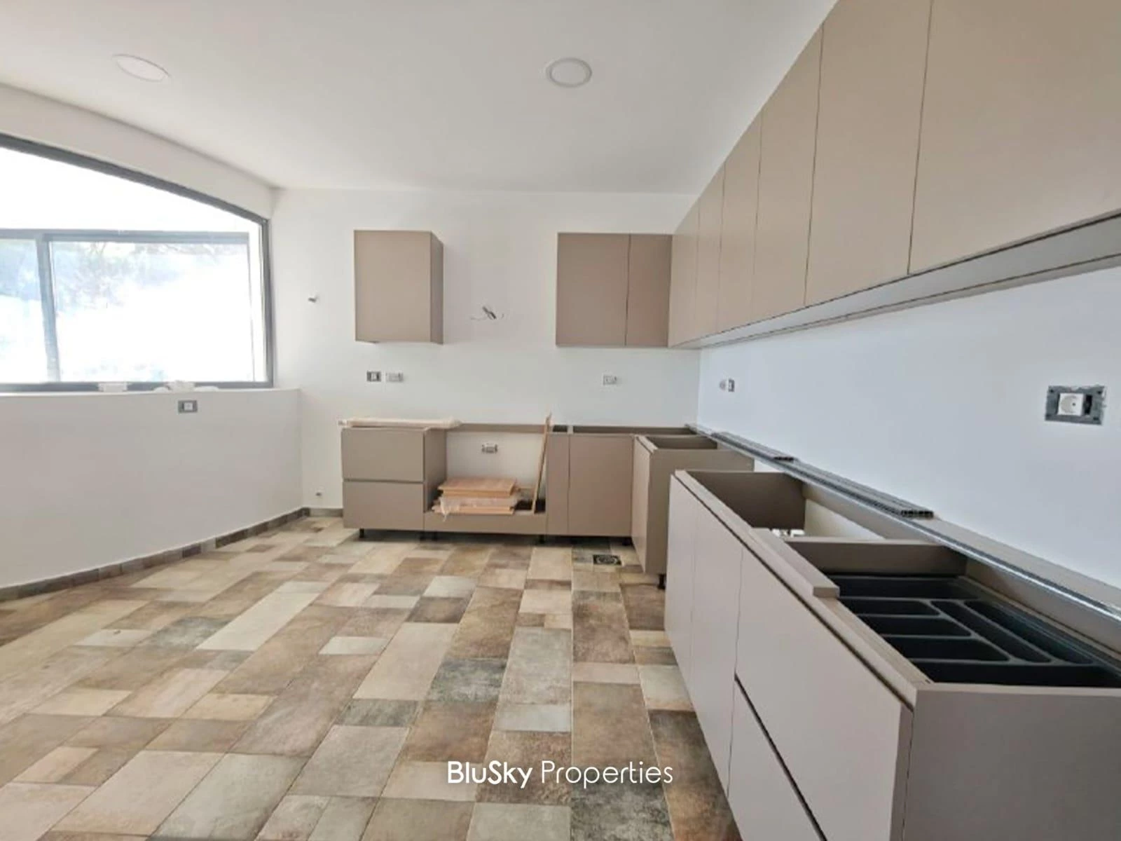 External Windows and doors are double glazed, Double Walls, Kitchen installed (Counter top + Cabinets), A/C Installation, Heating System Installed and much more !
