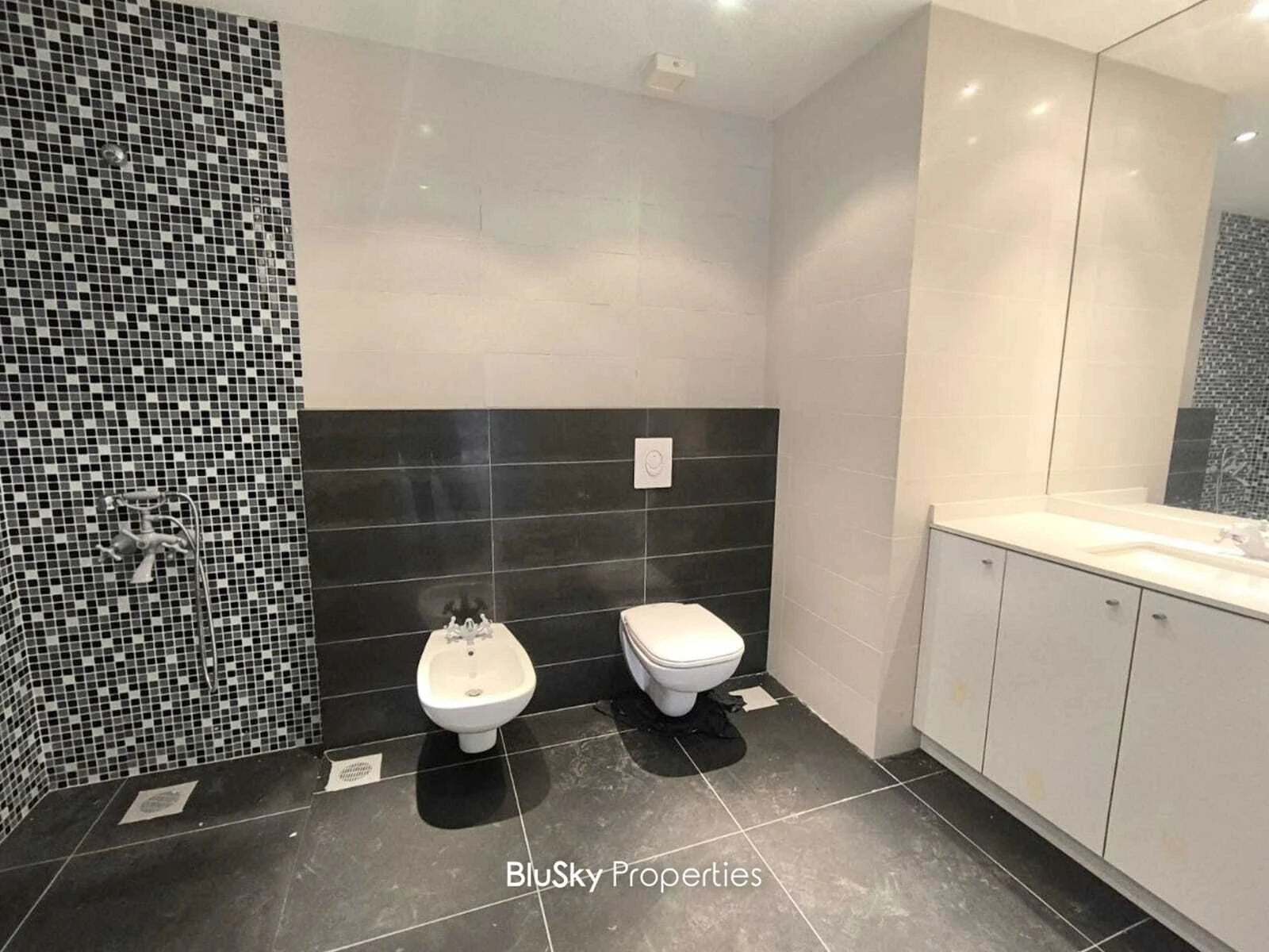 External Windows and doors are double glazed, Double Walls, Kitchen installed (Counter top+ Cabinets), A/C & Heating System Installed and much more !